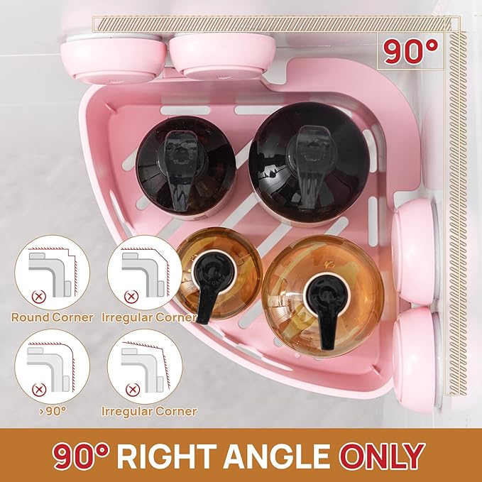 - Warm Tips: Please remember not to stick this suction cup corner shower caddy to the grout lines. This shower caddy only fits for standard 90° right angle corner. This powerful corner shower caddy works best on non-porous, impermeable, smooth surfaces such as glass, mirror, polished metal, stainless steel, plastic board, wall tile, grainy granite, etc. If you experience any problems during initial installation, please wash the suction cup, dry it with a hairdryer and test it on a smooth glass surface. If the suction holds, it means the original wall may not be suitable for using the suction cup, please change the installation location