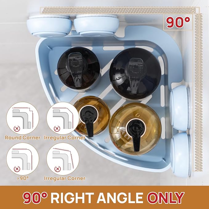- Warm Tips: Please remember not to stick this suction cup corner shower caddy to the grout lines. This shower caddy only fits for standard 90° right angle corner. This powerful corner shower caddy works best on non-porous, impermeable, smooth surfaces such as glass, mirror, polished metal, stainless steel, plastic board, wall tile, grainy granite, etc. If you experience any problems during initial installation, please wash the suction cup, dry it with a hairdryer and test it on a smooth glass surface. If the suction holds, it means the original wall may not be suitable for using the suction cup, please change the installation locatio