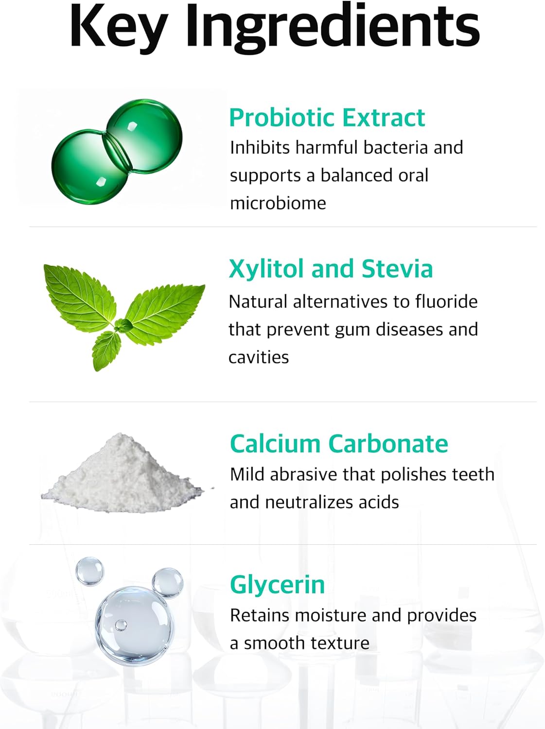 - Enamel Strengthening & Gentle Cleaning: Features precipitated calcium carbonate and probiotic ferment extracts for mild polishing, plaque control, and enamel support.