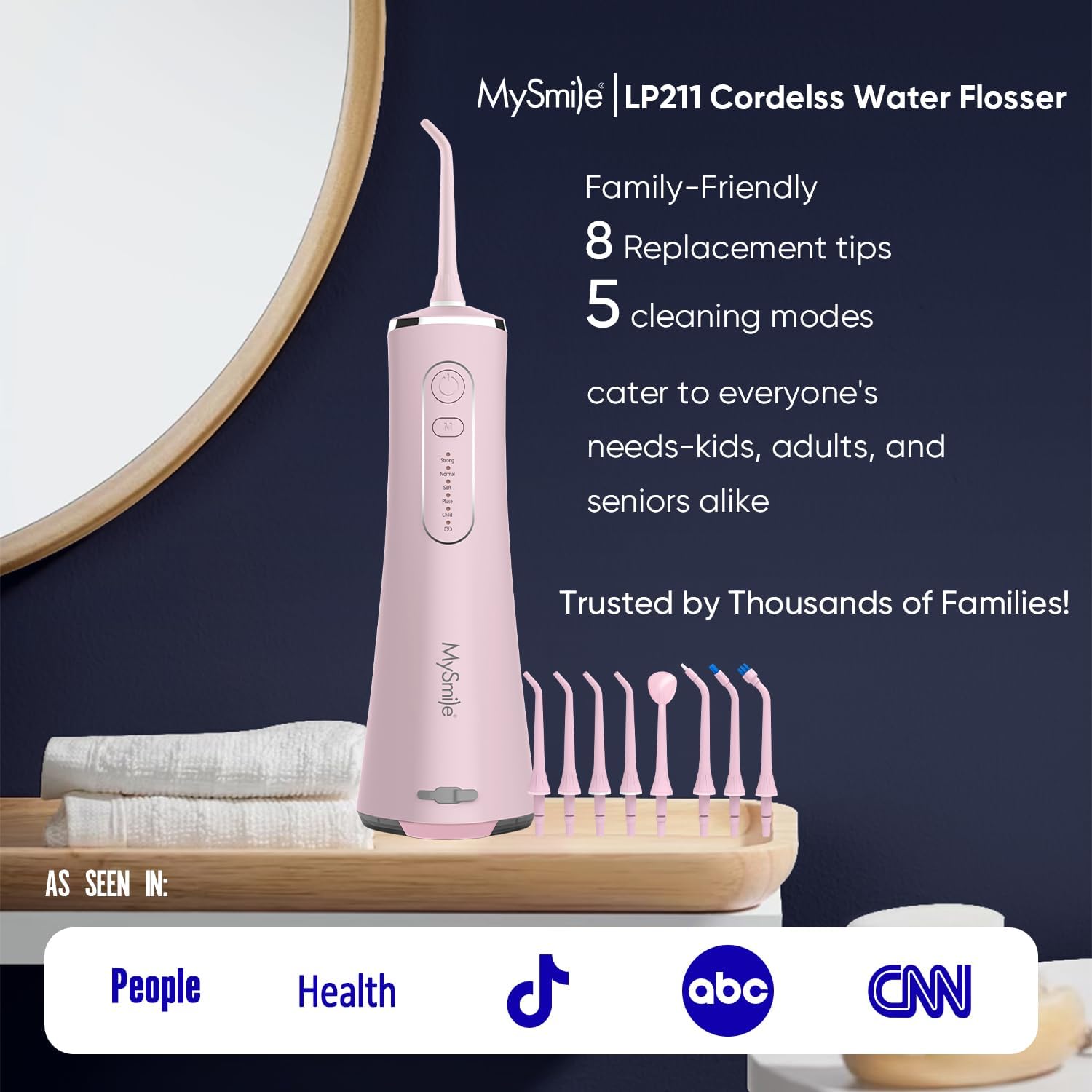 MySmile LP211 Cordless Water Flossers, Portable Rechargeable Oral Irrigator for Teeth Cleaning, 5 Cleaning Modes, IPX7 Waterproof, 8 Replacement Tips and a Storage Pouch (Juicy Pink)