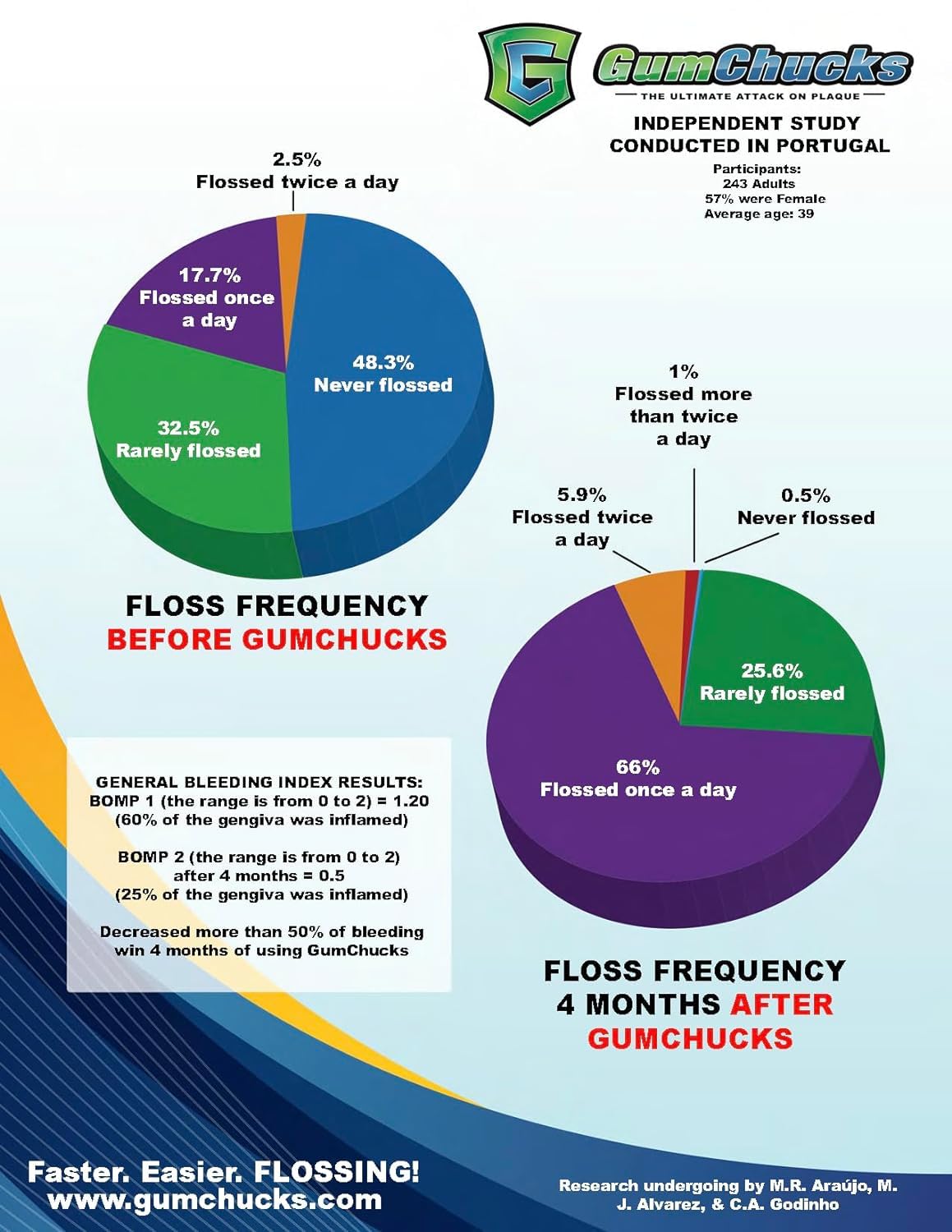 - Floss and Toss - Simply press the button to release the old floss pick. Independent Study demonstrated that GumChucks makes flossing so easy and fast, that 73.7% of people who tried GumChucks became regular daily flossers!