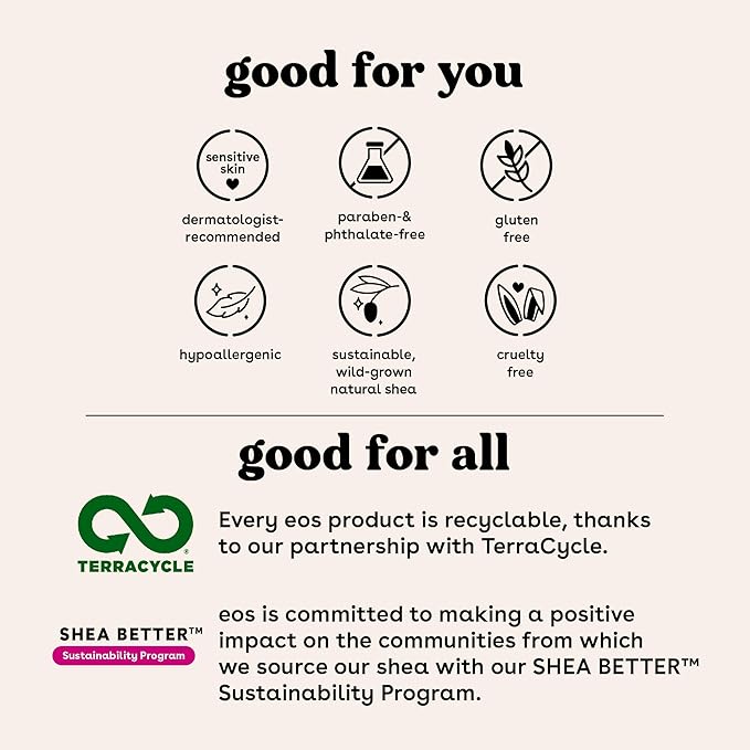 - SUSTAINABLY-SOURCED INGREDIENTS: eos Lip Balms have wild grown, sustainably sourced, natural shea butter and oil to leave your lips smooth and nourished