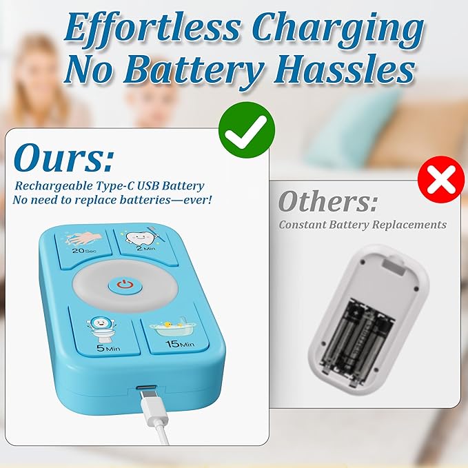 - Blue Kids Timer: Catchy and appealing to young children, making it a fun addition to their daily routine. The timer features clear, colorful images of handwashing, brushing teeth, using the toilet, and taking a shower, helping children easily identify and engage with each activity