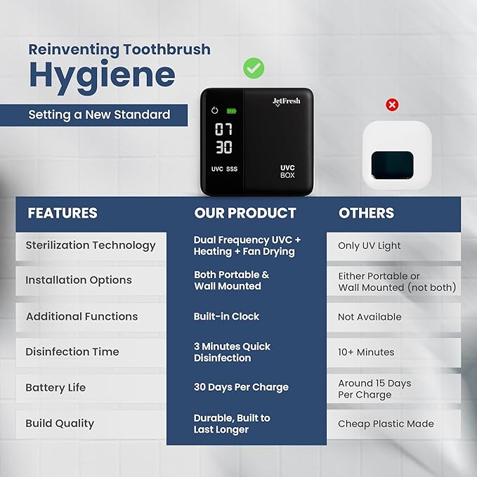 - Precision UV-C Care with Advanced Heating + Fan drying : Eliminate 99.9% impurities with powerful dual-band UV-C light and warm airflow. This UV tooth brush sanitizer holder keeps your brush cleaner and drier making it safe for daily use by the whole family.