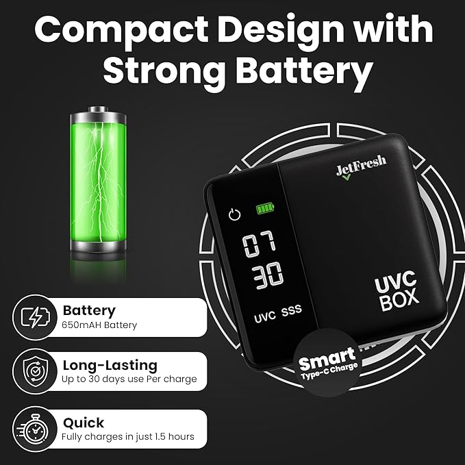 - Cordless, Rechargeable & Travel-Friendly : This compact toothbrush holders UV sanitizer Also works as a protective travel case. Its 650mAh battery lasts up to 30 days per charge and recharges in just 1.5 hours using a Type-C cable, perfect for home, office, or on-the-go.