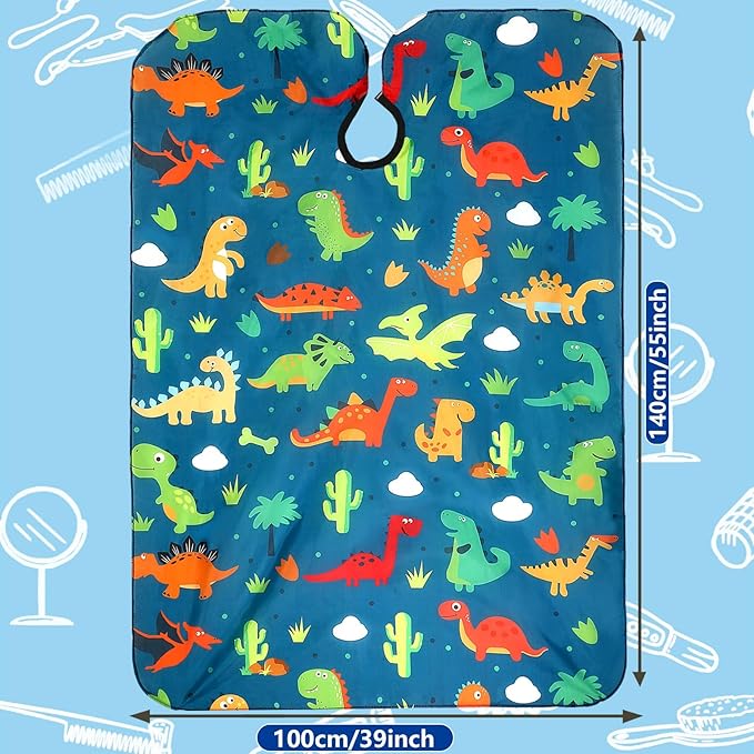 - Dinosaur-Themed Kids Haircut Cape: The kids cape for haircuts has a blue background and is printed with vivid and lovely cartoon dinosaur patterns, which is deeply loved by children, and can attract attention, relieve nervousness during hair-cutting and make the hair-cutting process more relaxed and enjoyable