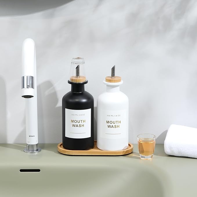 - Mouthwash Glass Containers with Lids: This mouthwash decanter has a glass mouthwash cup. When you are not using the mouth wash dispensers, it features a precise fit with a mouthwash container, acting as a cover to keep it clean and free from dust.
