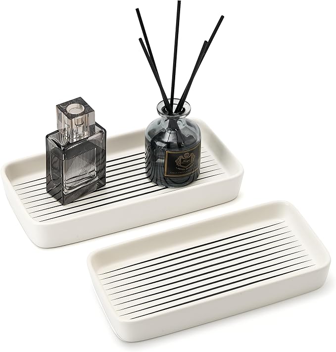 Bathroom Vanity Tray for Countertop,2PC Rectangle Striped Tray,Decorative Bathroom Organizer for Scrubber, Lotion Bottles, Perfume, Jewelry, Candle, Key Trinket Ring(Small,White)