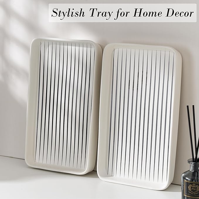 Bathroom Vanity Tray for Countertop,2PC Rectangle Striped Tray,Decorative Bathroom Organizer for Scrubber, Lotion Bottles, Perfume, Jewelry, Candle, Key Trinket Ring(Large,White)