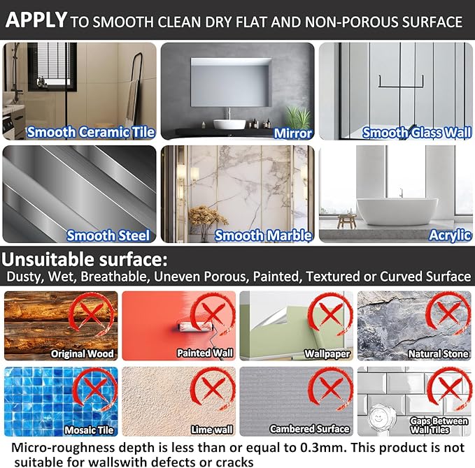 - Things to Know Before Purchasing: The suction cups will only stick to smooth, non-porous surfaces such as metal, glass, tile and acrylic but will not stick to uneven tiles, textured panels, unfinished marble, wallpaper, painted walls, etc. Please refer to the pictures for details. Also, if it accidentally comes off due to misuse, simply rinse the suction cup and let it air dry before reattaching.
