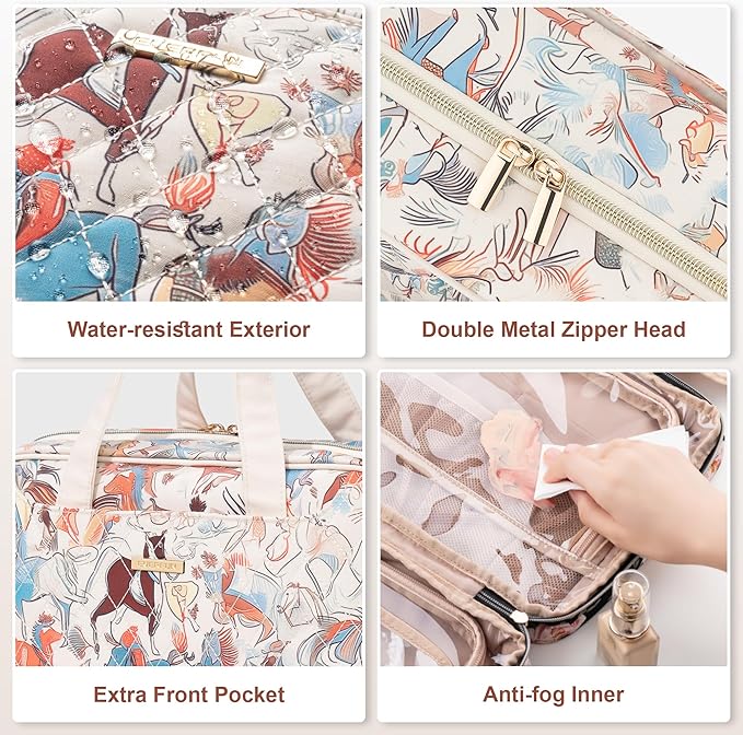 - STAY ORGANIZED & EASY ACCESS: This bag features 4 compartments, with multiple pouches designed for cosmetics securely holding small items; Elastic bands keep bottles upright; A front pocket offers additional storage and quick access to makeup essentials.