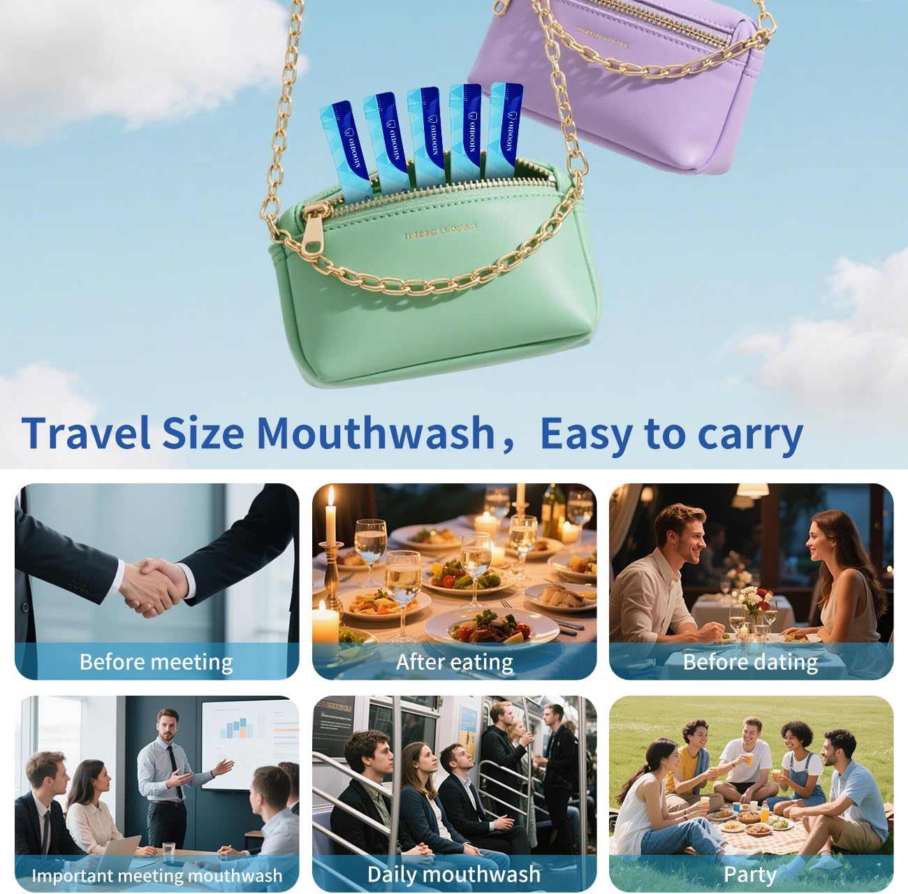 - The mouthwash is designed in travel size for easy portability. These small and independent packages can perfectly fit in your pocket, wallet, or carry on luggage, ensuring fresh breath.