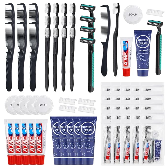 - What Will You Get: You will receive 60 set personal hygiene kits. Each kit includes 1pcs toothbrush, 0.6oz toothpaste, 1pcs comb, 0.53oz soap, 1pcs razor and 1 oz shaving cream. Individually sealed package provides the possibility for you to store them separately in many places.