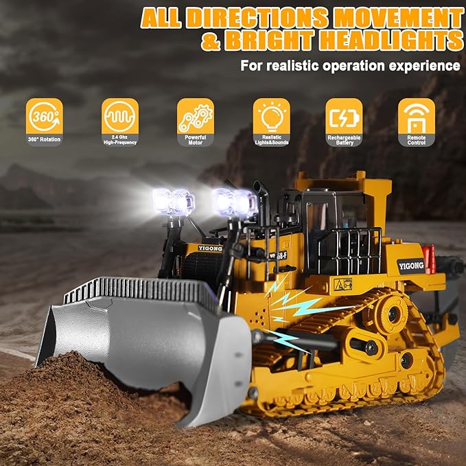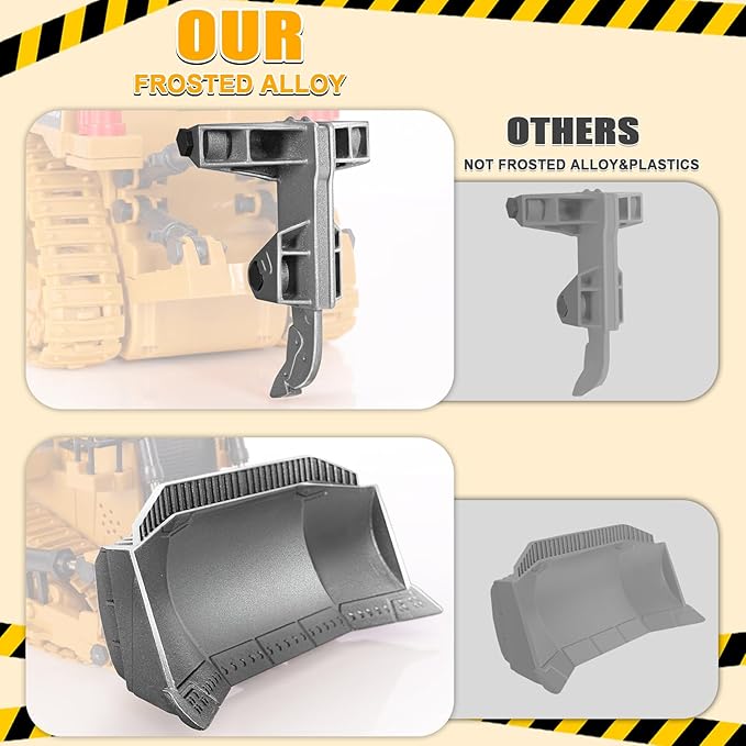 - 【Multifunctional, Powerful & Flexible】Our RC bulldozer features a 9-channel control system, 2.4GHz frequency and a wireless infrared remote control, allowing you to easily drive it in any direction. It comes with a one-touch demonstration mode, 360-degree rotation, a durable alloy bulldozer blade, and an adjustable alloy loosener. More exciting control combinations are waiting for you to explore!