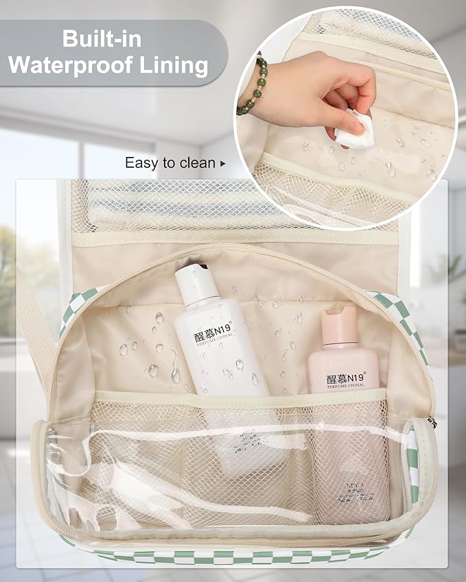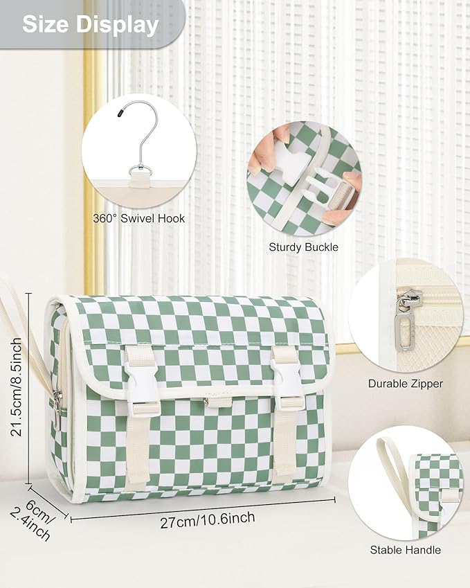 Relavel Travel Hanging Toiletry Bag for Women, Large Capacity Wash Bag with 360 degree Rotation Hanging Hook, Portable Toiletries Makeup Organizer Storage for Daily Use, Trip, Camping - Green Plaid