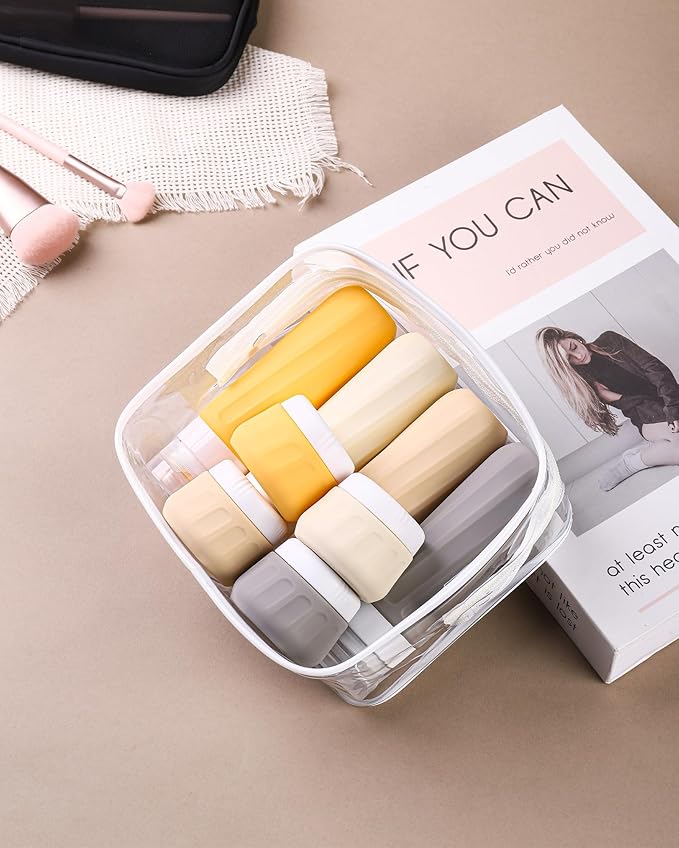 Travel Size Toiletries 8 Pack, TSA Approved 3oz/1oz Silicone Squeezable Creams Jars with Clear Travel Bag