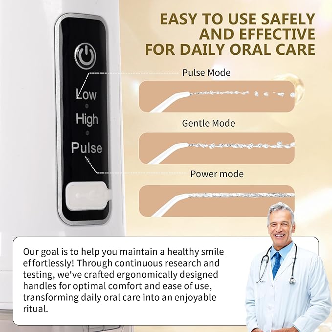 - 【Multiple modes】oral irrigator comes with three cleaning modes - Gentle, Pulse, and Strong. Whether you're new to using a water flosser or need a deep oral clean, it can easily meet your diverse oral care needs. Additionally, it has an IPX7 waterproof rating, so you don't have to worry about exposure to large amounts of water during use. This ensures safe product operation and effectively prevents leaks, providing comprehensive protection for your oral care routine.