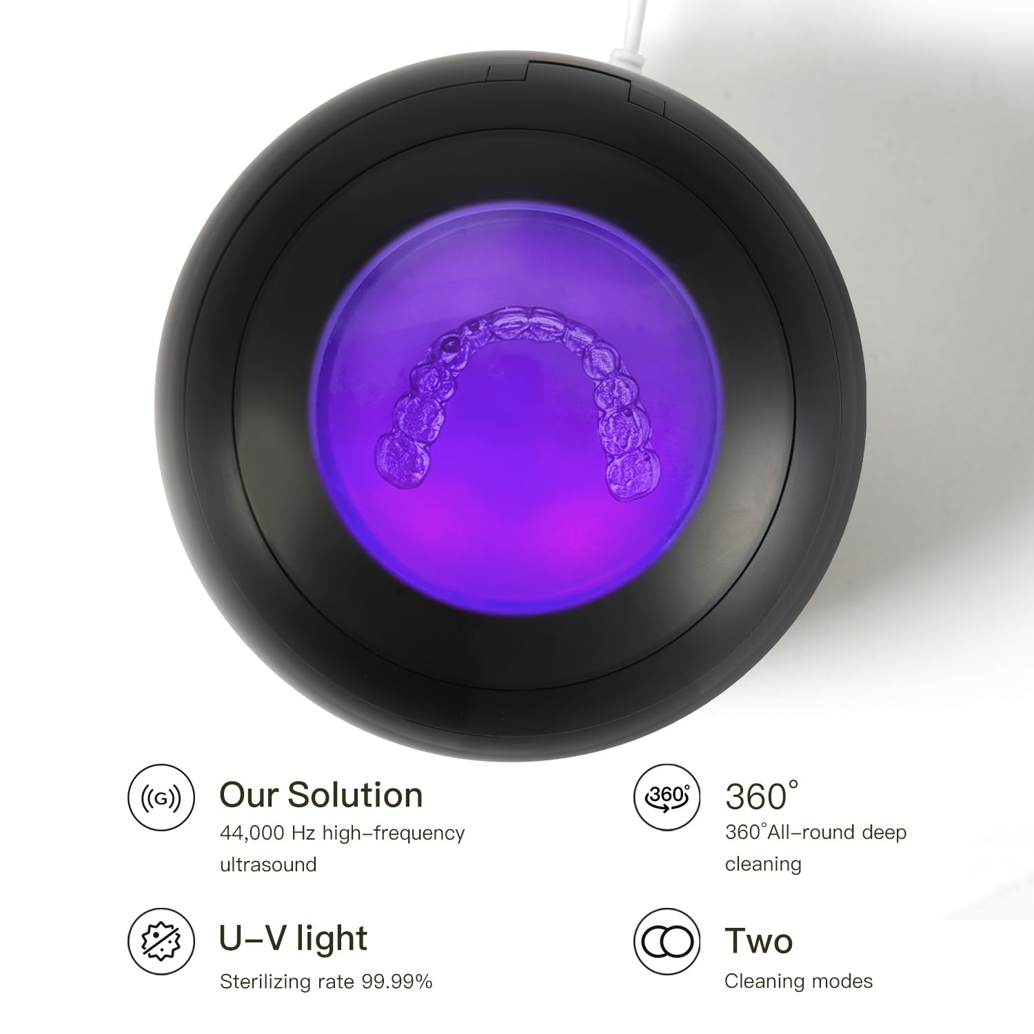 Dental Ultrasonic Retainer Cleaner Machine: 45kHz Dental Cleaning Pod for Denture, Aligner, Mouth Guard, Night Guard, Braces & Jewelry, UV Denture Cleaner with Digital Timer & Dual Mode 250ML Black