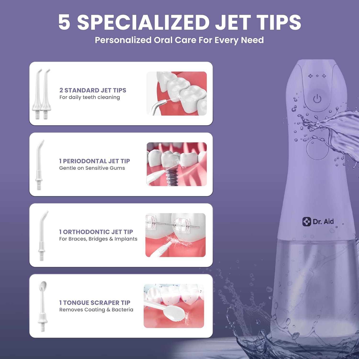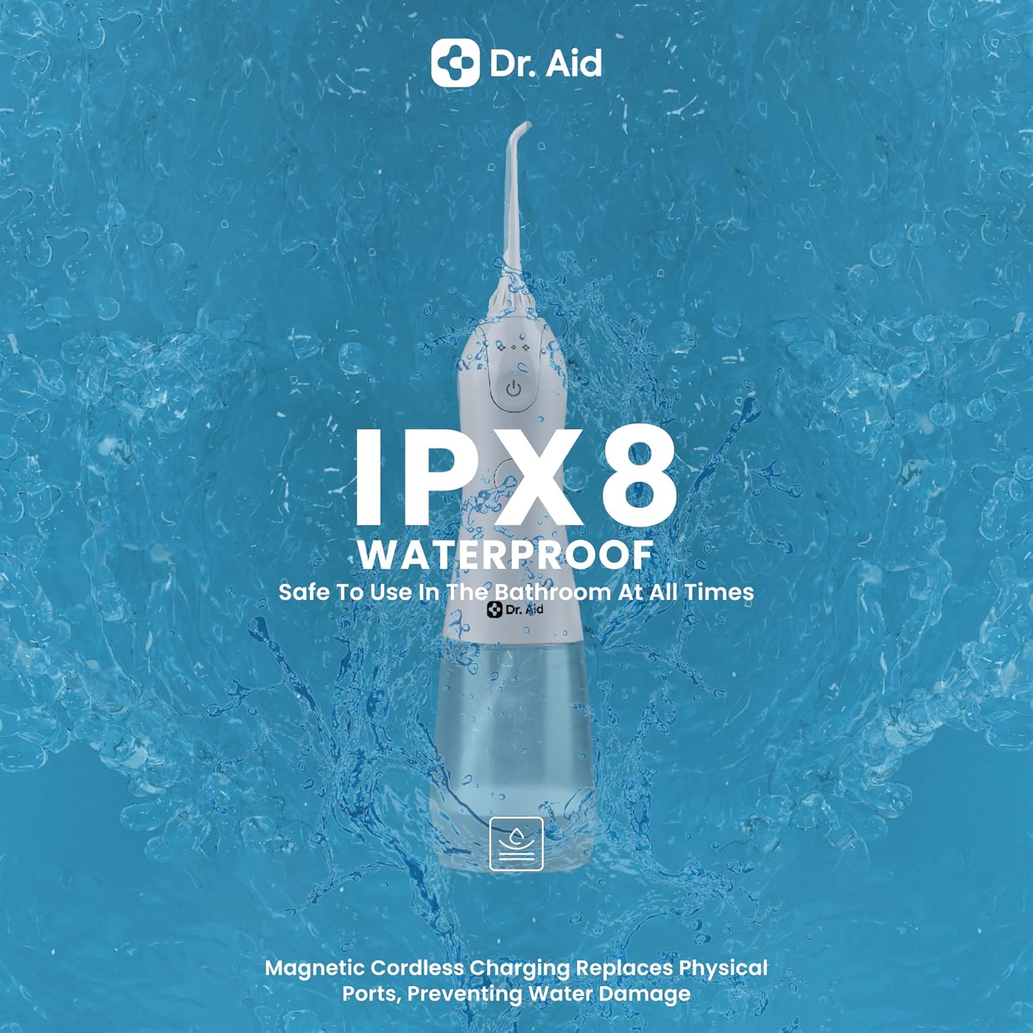 - Easy Operation With 5 Tips & 3 Modes: The Dr. Aid Water Flosser simplifies oral care with 5 tips for teeth, gums, braces and tongue. Water flosser operates in 3 modes - Standard, Soft, and Pulse. This water flosser cordless design allows for easy use at home or on the go. Being IPX8 waterproof, it’s safe to use in the shower, making it a perfect portable water flosser for those seeking a cordless water flosser that combines convenience and powerful performance. This Dr. Aid water flosser flosser offers high pressure water pulse of 1800 times/min and generates 0.6mm High frequency pulse water column to be precise and effective dental water flosser.