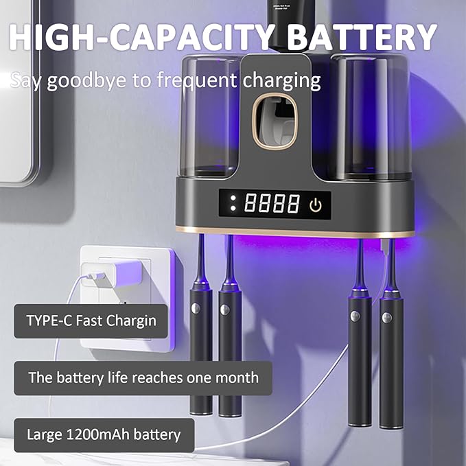 Toothbrush Holders for Bathrooms with Air-Drying, Toothbrush Sanitizer Holder with Smart Countdown LED Screen, 2 Cups Electric Toothbrush Holders Wall Mounted with Toothpaste Dispenser