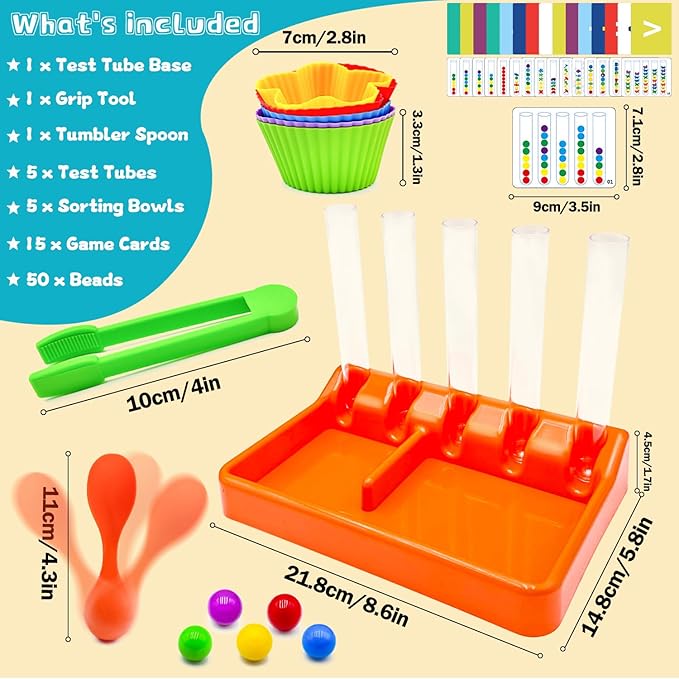 - Package Includes:The sorting set comes in a value pack with 50 beads, 5 x tubes, 1 x grip tool, 1 x tube base, 1 x tumbler spoon, 15 challenge flash cards, a variety of fun game modes encourage your child to grow and let them have fun while learning