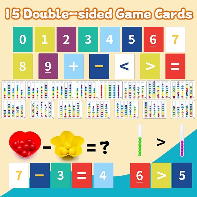 - Interesting Combination:This is an educational open-ended toy. With the use of double-sided activity cards, kids can engage in a variety of activities such as color matching and number recognition,help kids master early math skills,like comparing, adding, subtracting, counting, etc. The tweezers included in the set also help to improve fine motor skills and hand strength, the addition of the tumbler spoon also brings a lot of fun to this game