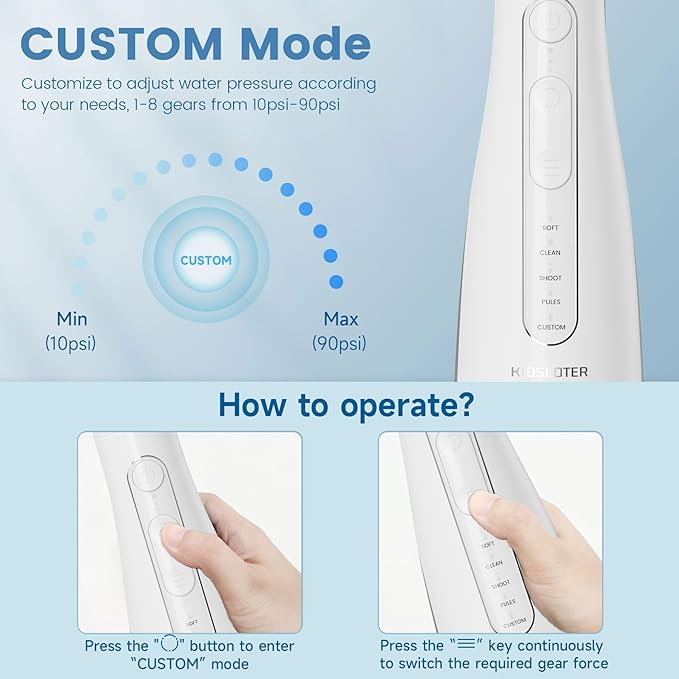 - 🦷 5 Customizable Cleaning Modes + 8 Adjustable Pressure Settings Tailor your flossing experience with 5 modes (Normal/Soft/Pulse/etc.) and precisely control water pressure across 8 levels—perfect for sensitive gums, braces, or deep cleaning.