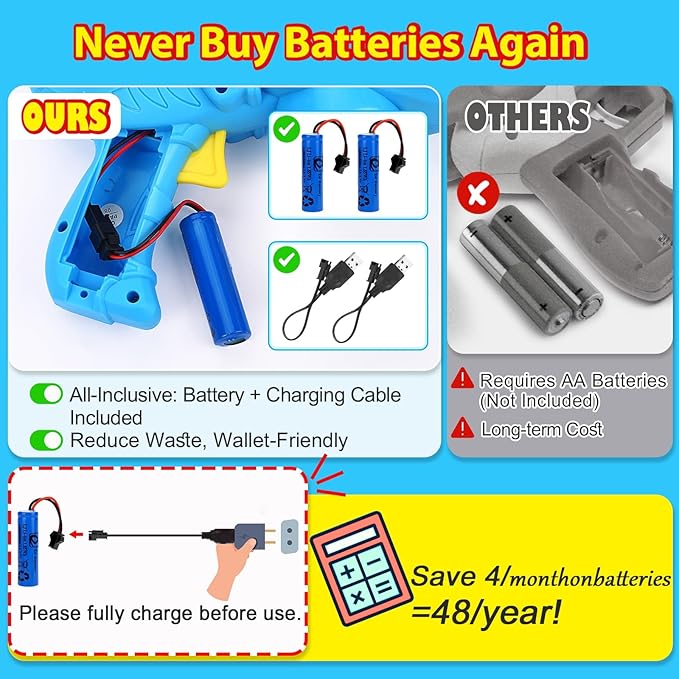 - No More Constant Battery Swaps: Each bubble outdoor toy comes with a rechargeable battery, giving endless bubble fun. Easy to charge and built to last. Just plug in, recharge, and get back to blowing endless bubbles! Our bubble gun helps you saving money and reducing waste from disposable batteries. Perfect outside toys for kids ages 4-8!