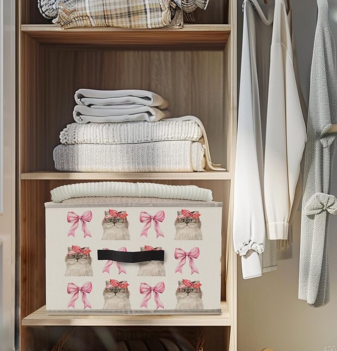 Nogrit Coquette Pink Bow Cat Storage Bins Box, Toybox for Girls, Preppy Cute Cat Kitten Foldable Baskets Organizer Container with Handles for Kids Girls Bedroom Bathroom Clothes Toys Books