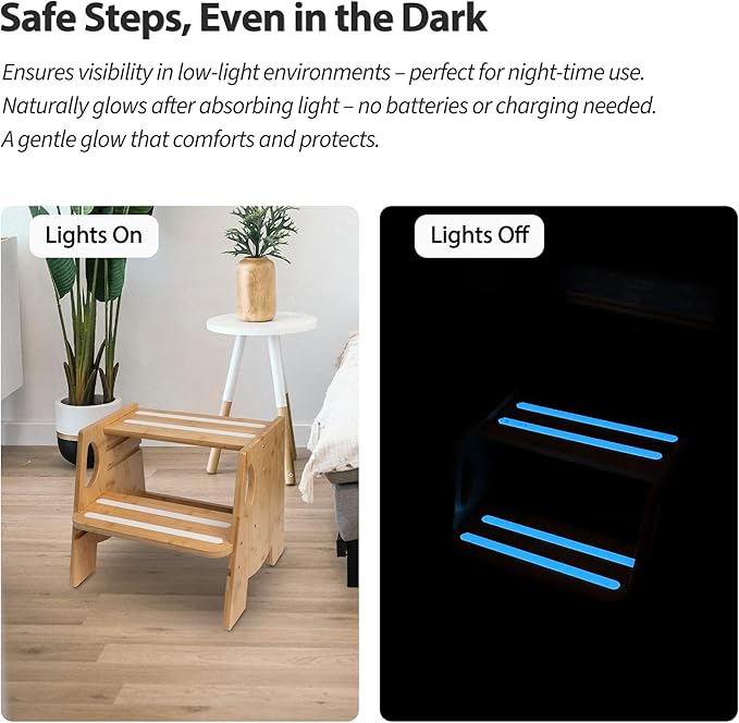 Wooden Toddler Step Stool for Bathroom Sink, Height-Adjustable, Luminous Anti-Slip Strips, Bamboo 2-Step Stool for Kids Adults, 300lbs, for Toilet Potty Training, Kitchen Counter, Bed