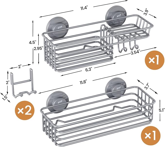 - Humanized Hooks and Soap Holder: Large capacity for shampoo, shower gel, cosmetics, hair conditioner, hand washing liquid and soap. Also shower baskets includes 2 large size hooks, you can hand your razors, towels, brushes on it. The shower holder organizer works great in the shower/ bathroom/ bathtub/ kitchen/RV and more, meet all your storage requirement