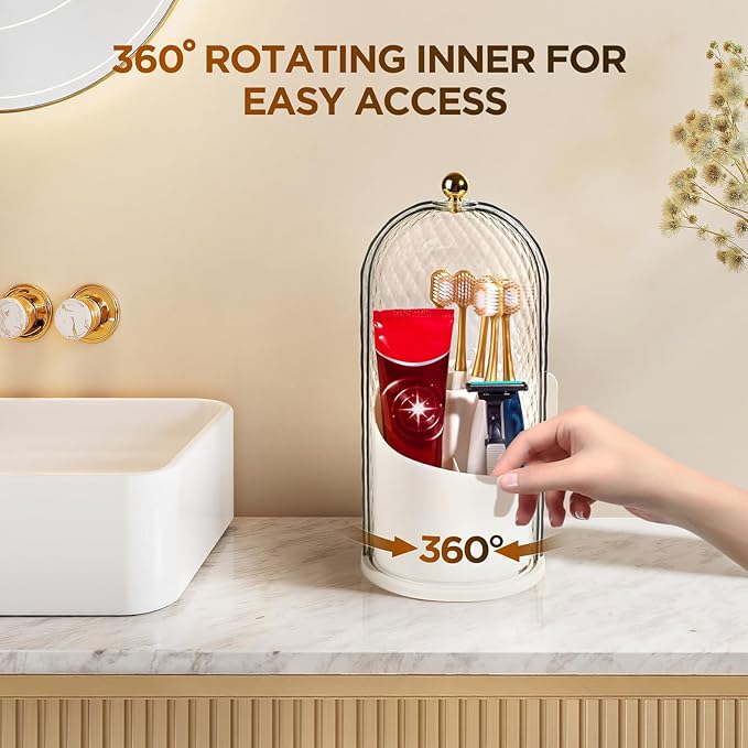 - 💧【ROTATING STORAGE SYSTEM】The toothbrush stand features 3 rotating compartments (360° access) to store oral care items; everything stays within easy reach.