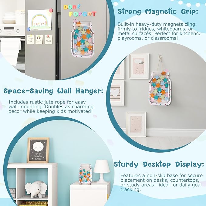 - Three display methods: The size of the children's reward jar is 8.27 inches x 5.31 inches. It is made of high-quality natural wood and acrylic material. The wooden surface is exquisitely crafted and can withstand the wear and tear of daily use. It has three display modes, one is a bracket, one is a magnetic strip, and the other is a hemp rope. It can not only be placed on a bracket, firmly attached to a blackboard or refrigerator, but also hung on a wall