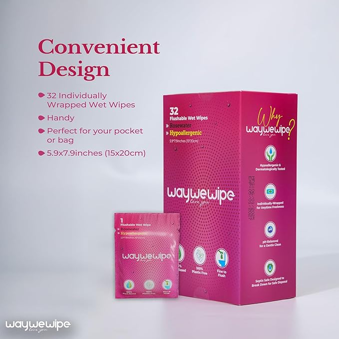 On-The-Go Flushable Feminine Wet Wipes, 32 Count XL Individually Wrapped Female Wipes, Hypoallergenic 100% Plant Based Septic Safe, Travel Size Adult Cleansing Cloth for Women, Rosewater