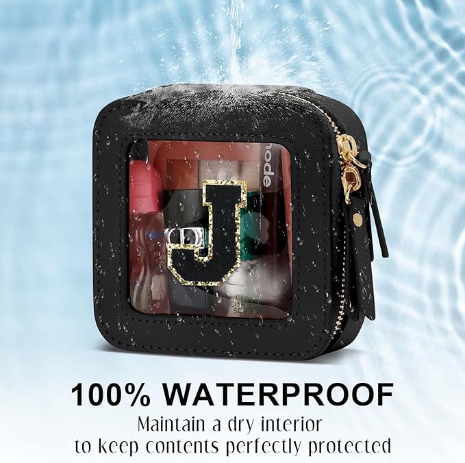 Initial Travel Toiletry Bag - Cosmetic Bags for Girls with Zipper, Clear & Potable Girls Makeup Bag for Travel, Small Cosmetic Pouch Perfect Gifts for Graduation (Black, J)