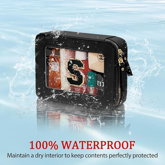 Initial Travel Toiletry Bag - Cosmetic Bags for Girls with Zipper, Clear & Potable Makeup Bag for Travel, Cosmetic Pouch Perfect Gifts for Graduation (Black, S)