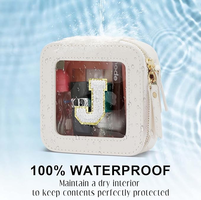 Initial Travel Toiletry Bag - Cosmetic Bags for Girls with Zipper, Clear & Potable Girls Makeup Bag for Travel, Small Cosmetic Pouch Perfect Gifts for Graduation (Beige, J)