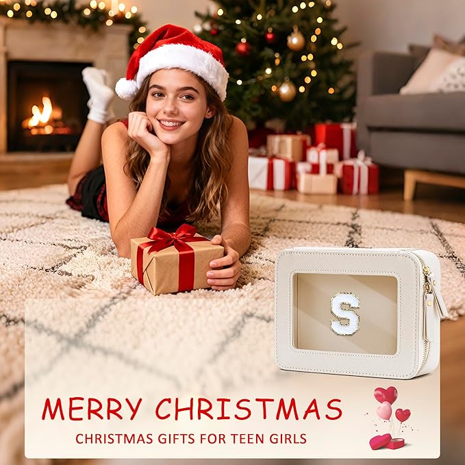 Initial Travel Toiletry Bag - Cosmetic Bags for Girls with Zipper, Clear & Potable Makeup Bag for Travel, Cosmetic Pouch Perfect Gifts for Graduation (Beige, S)
