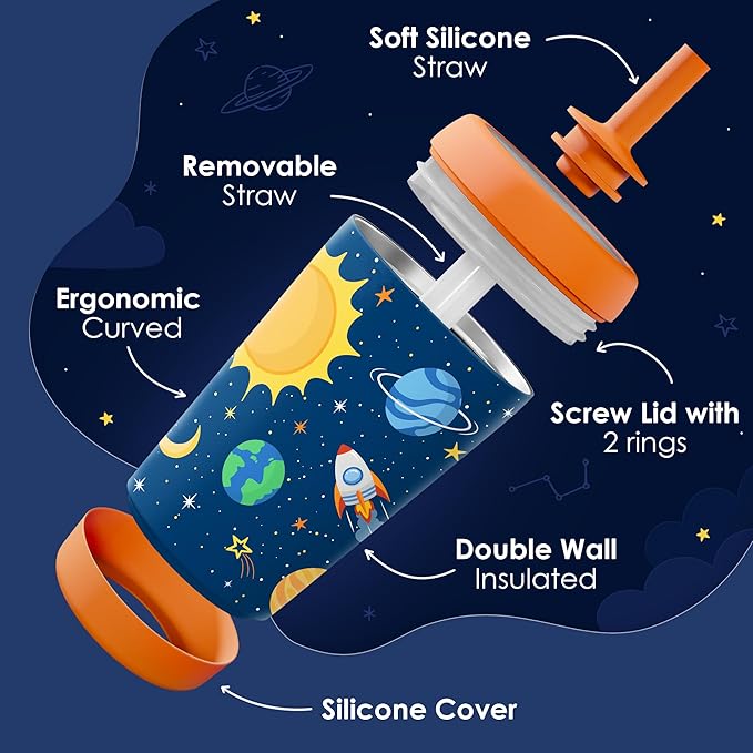 Kid Insulated Stainless Steel Tumbler with Silicone Straw, 12oz Sippy Cup for Kids (Outer Space)