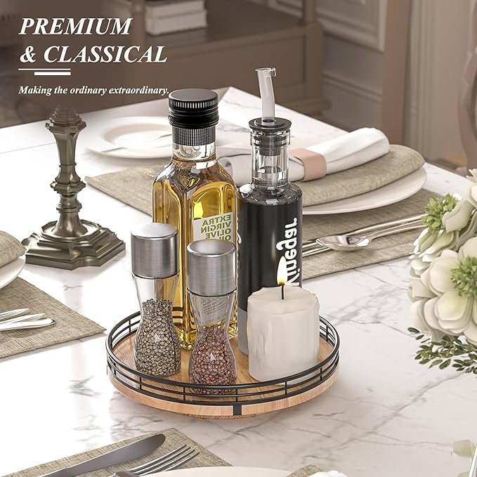 - UPDATED DESIGN: With larger wood base on this lazy Susan for table top, the turntable organizer doesn't wobble, even with heavier items on it. With premium oak wood and classical iron fence make this lazy Susan turntable stylish, functional and adding a touch of rustic charm. it’s also very easy to clean. There are included anti-slip pads on the bottom of the lazy Susan for extra surface protection.