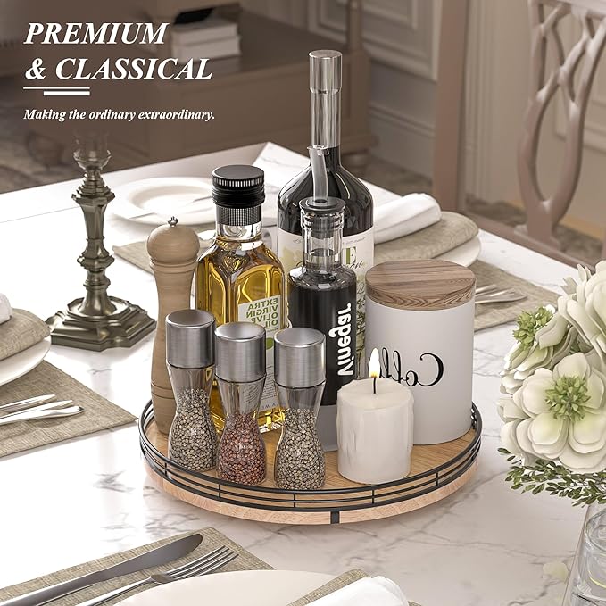 - 360 RATATING & MAXIMIZE SPACE: The base is made of solid wood and the spinning mechanism is made of steel ball bearings, which are well-built and allow for 360° smoothly spin. Making it super easy to access items at the back of your cabinet without having to remove everything in front. You can use it to store spices, condiments, and even small jars, and it keeps everything neatly in place.