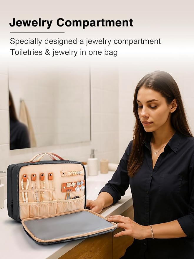 - The All-Round Organizational Expert: Size - 12.6"L x 9.5"H x 4.8"W, this spacious toiletry bag features four interior compartments that fit up to 8 full-sized toiletries plus smaller cosmetics. A front jewelry pocket and a separate wet/dry compartment keep your travel essentials organized and easy to access, making packing an easy job.