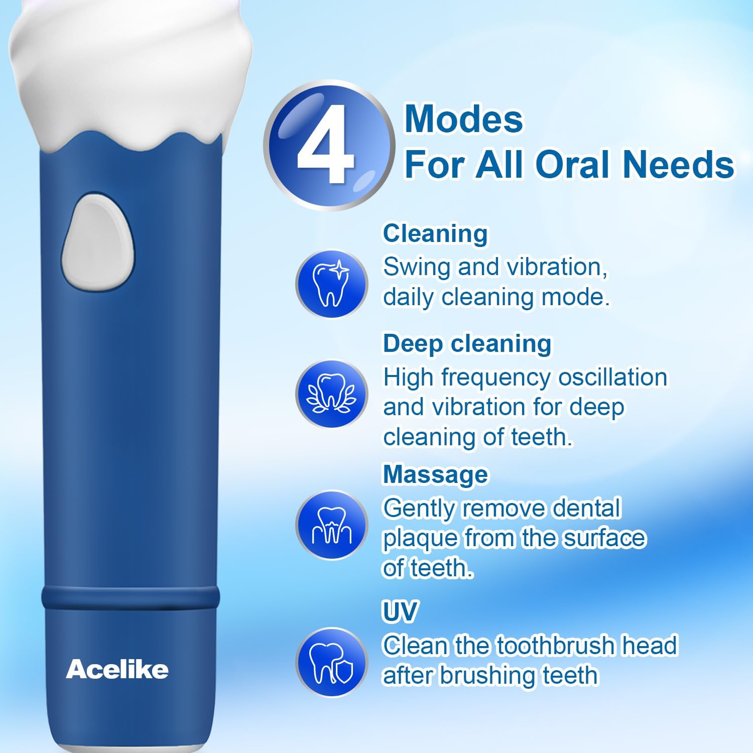 - 2-Minute Smart Timer: Acelike kids electric toothbrush has a built-in 2-minute intelligent timer and a 30 second reminder to switch brushing areas, helping children develop good teeth cleaning habits.