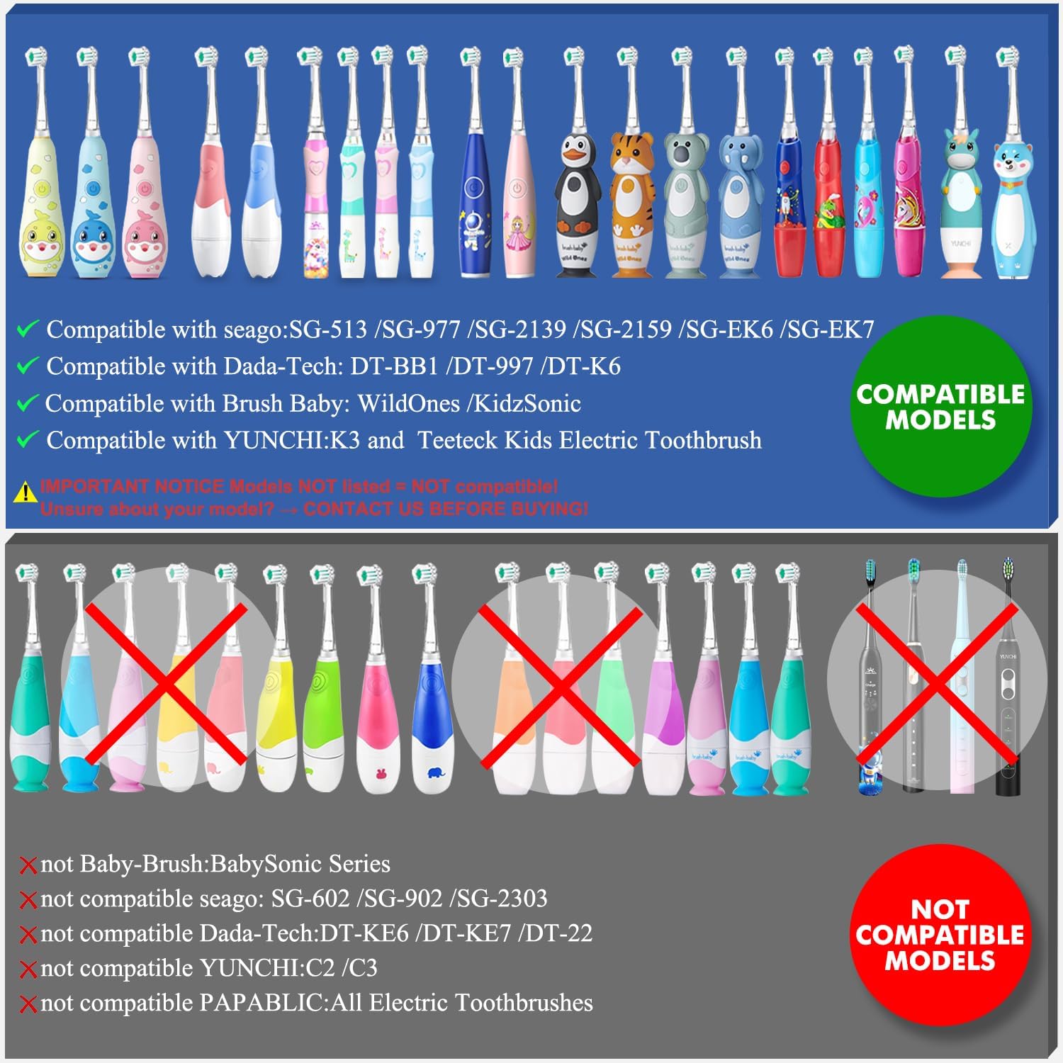 - SUPERIOR COMPATIBILITY :Perfect fit for SEAGO SG513/SG977/SGEK6, DadaTech DT-K6/DT-BB1/DT-977, Brush-Baby WildOnes/KidzSonic Series, and BabySmile S-204B.*Not compatible with BabySonic Series or SG-602/902.* Unsure? Check product images for your toothbrush model or contact Teeteck support for instant confirmation.