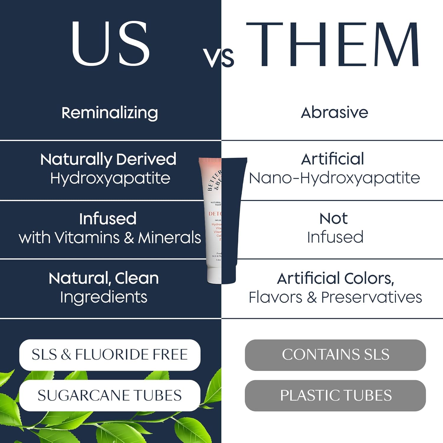 - Infused with Hydroxyapatite, Vitamin E, B12, Calcium & Zinc: Detoxify delivers a deeper clean with a powerful blend of enamel-supporting and bacteria-fighting nutrients. Hydroxyapatite helps remineralize enamel, while Vitamin B12 and Zinc support immune health, help soothe canker sores, and fight bad breath by targeting odor-causing bacteria. Dentist-approved and fluoride-free for everyday defense.