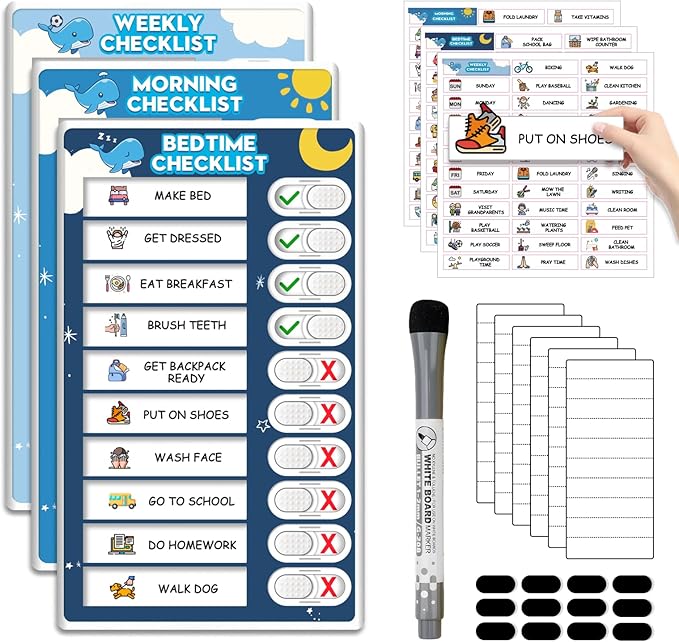 Upgraded Slider 3 in 1 Bedtime/Morning/Weekly Routine Chart for Kids, Magnetic Chore Chart for Kids with 99 Stickers, Cute Visual Schedule for Kid