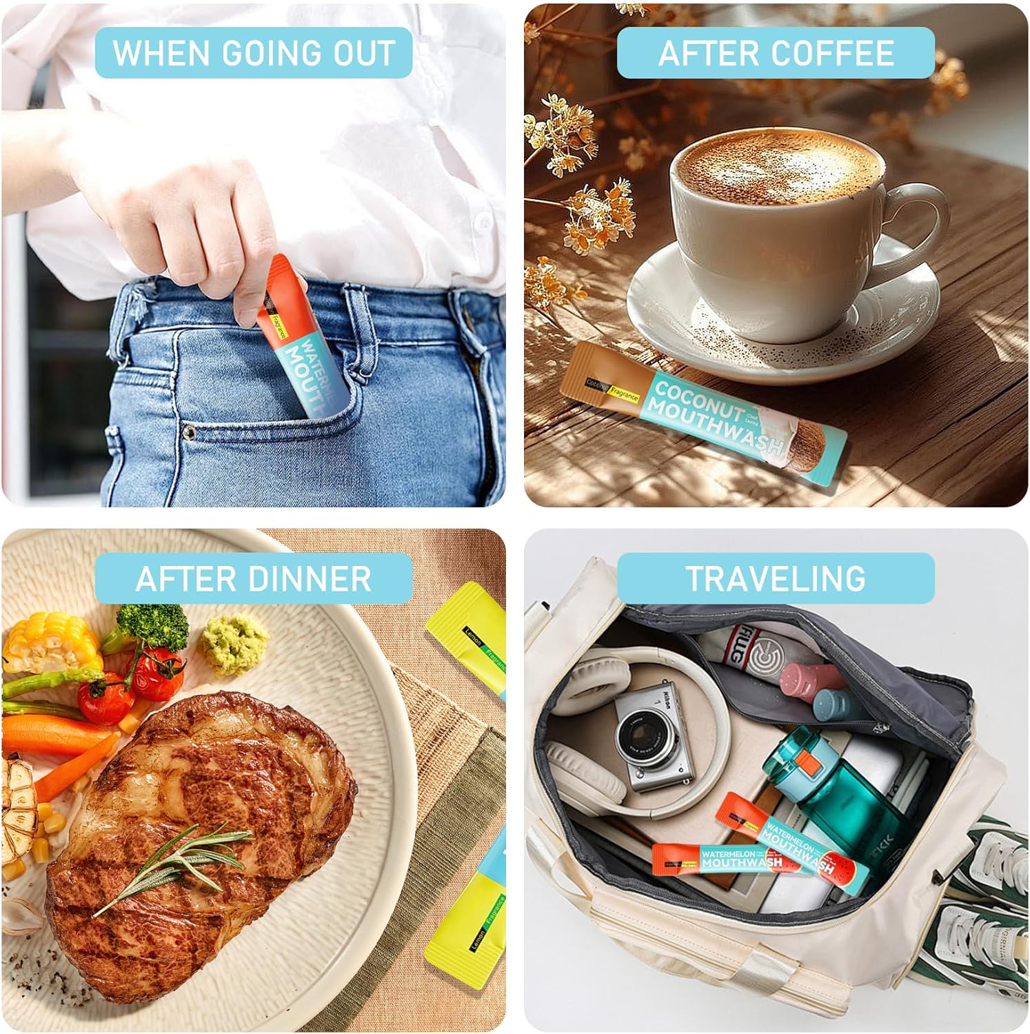 - Easy to Use: First tear open the mouthwash package and pour the mouthwash for 60 seconds, then spit it out without rinsing your mouth with water, very easy to use