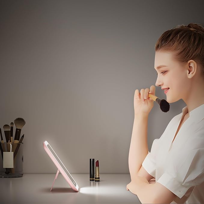 Kintion Travel Makeup Mirror, 6"*4.2" Rechargeable Portable LED Lighted Tabletop Vanity Mirror, 3 Colors Touch Dimmable Compact Mirror for Women Gift, Pink