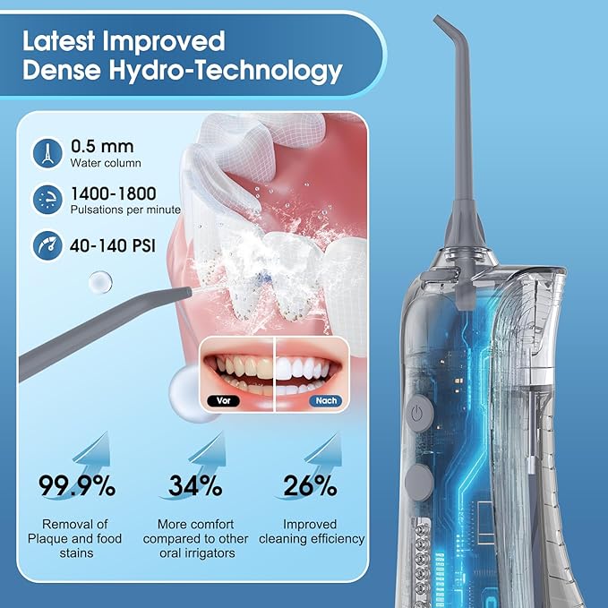 - 【5 Modes & 2 Minutes Smart Memory Function】The water flosser teeth cleaner features 5 settings of water pressure from 40-140PSI and a low noise design(less than 55db) to meet a variety of oral care needs. Innovative memory feature allows you to continue using your favorite mode the next time you use it.