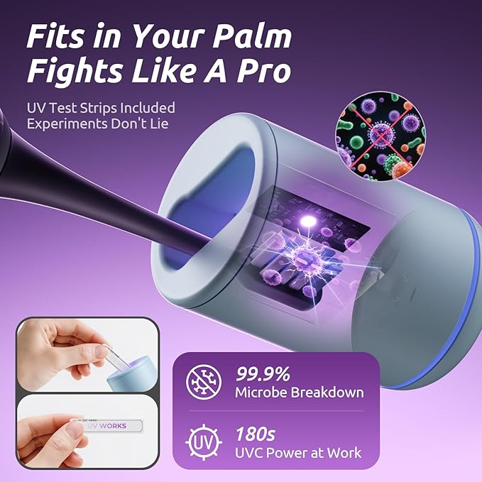- Fits in Your Palm, Fights Like A Pro: 99.9% Cleaning Rate in 3 Minutes Flat With UVC 270-280nm Light Technology.We Get It - Seeing Is Believing. That's Why The UV Toothbrush Holder Comes With Instant Test Paper. Check UV Intensity Yourself Anytime, No Lab Required.